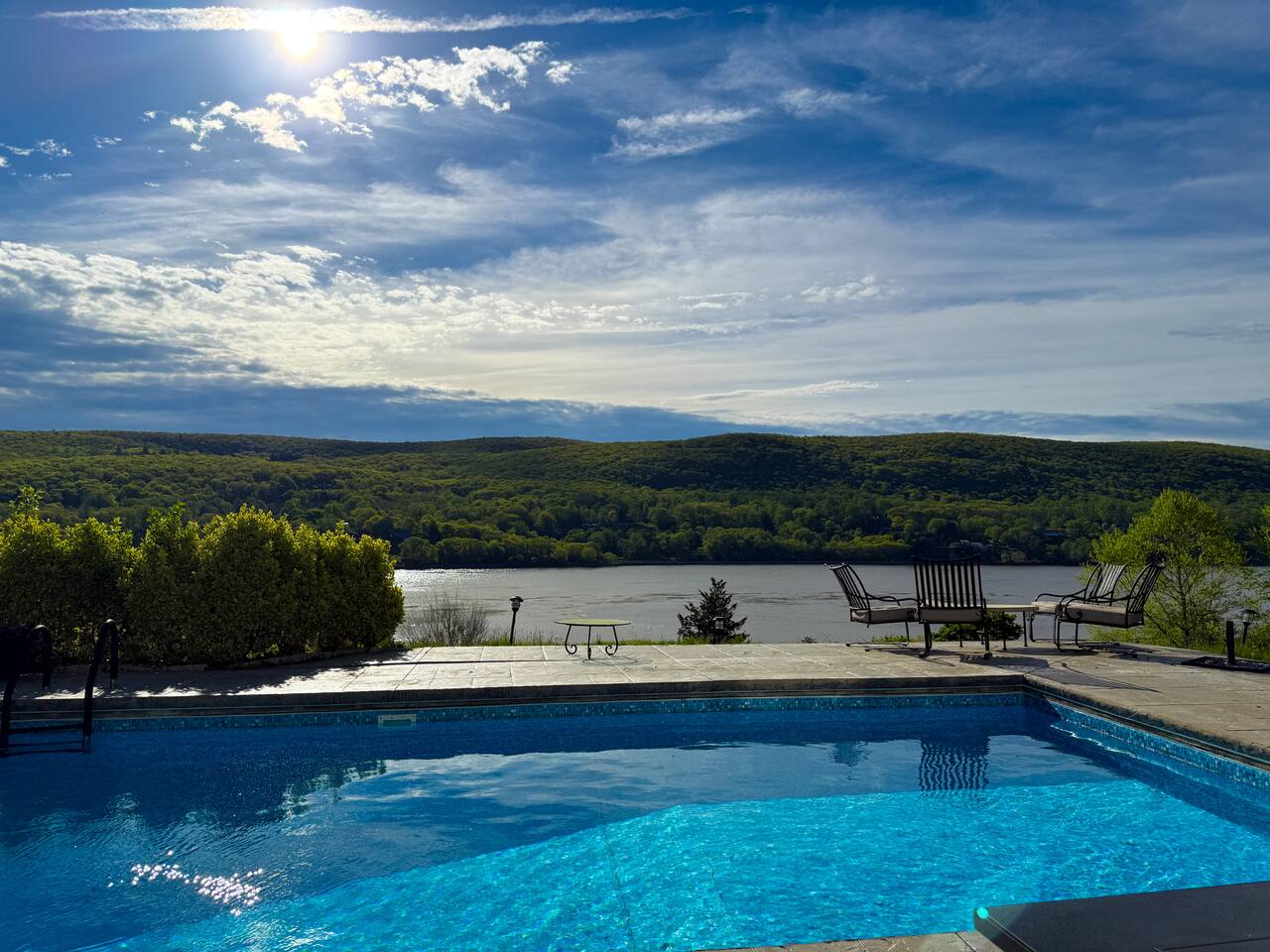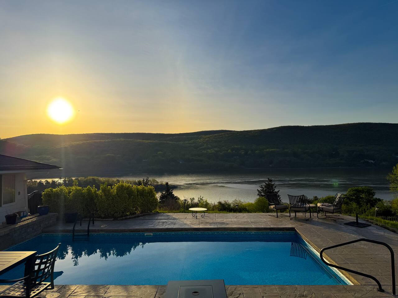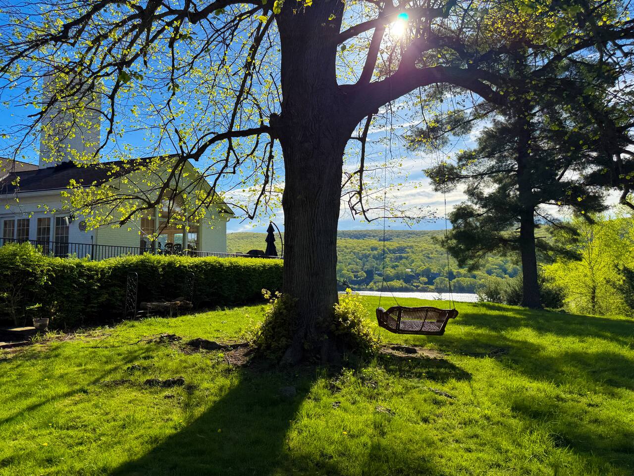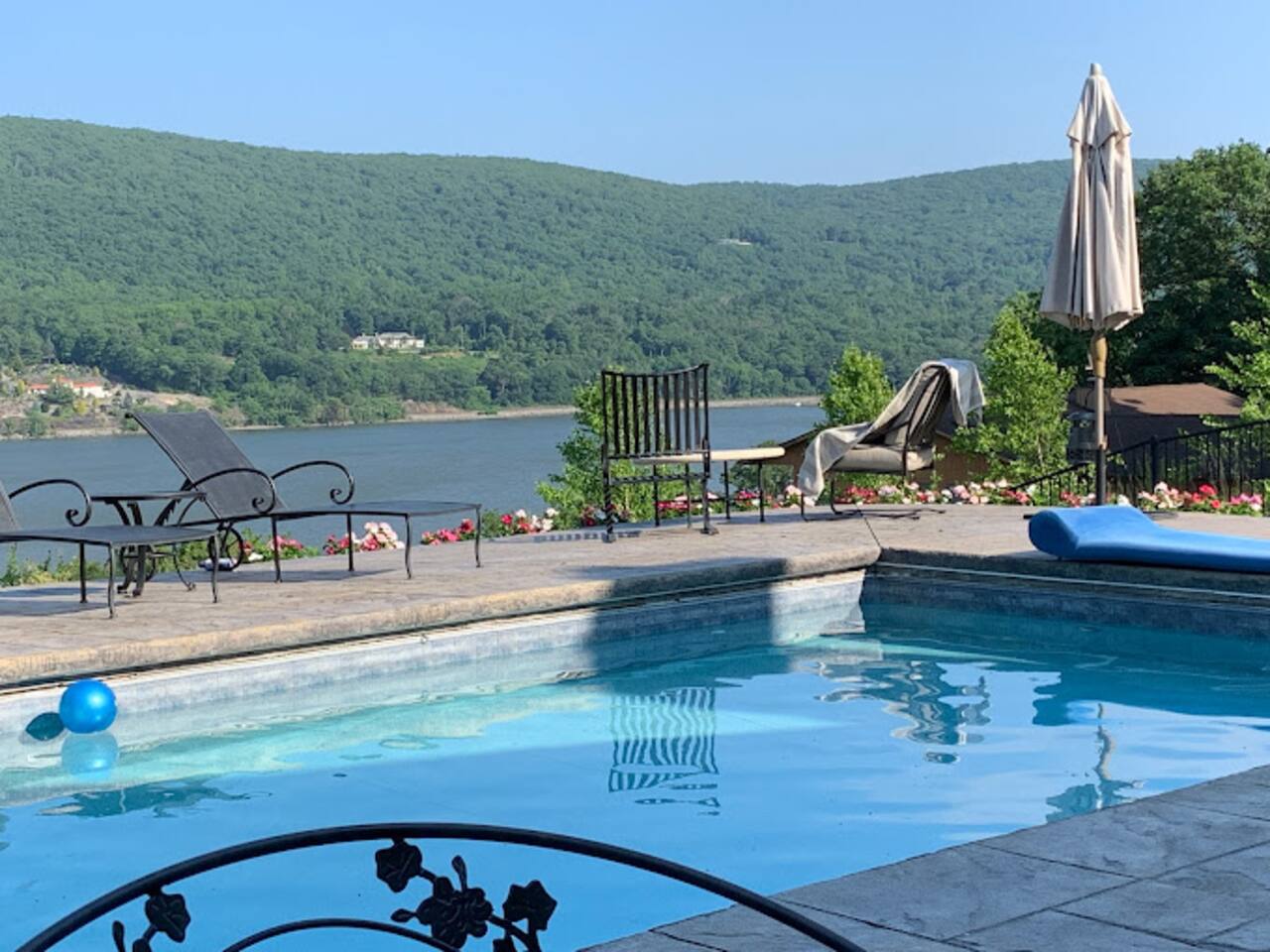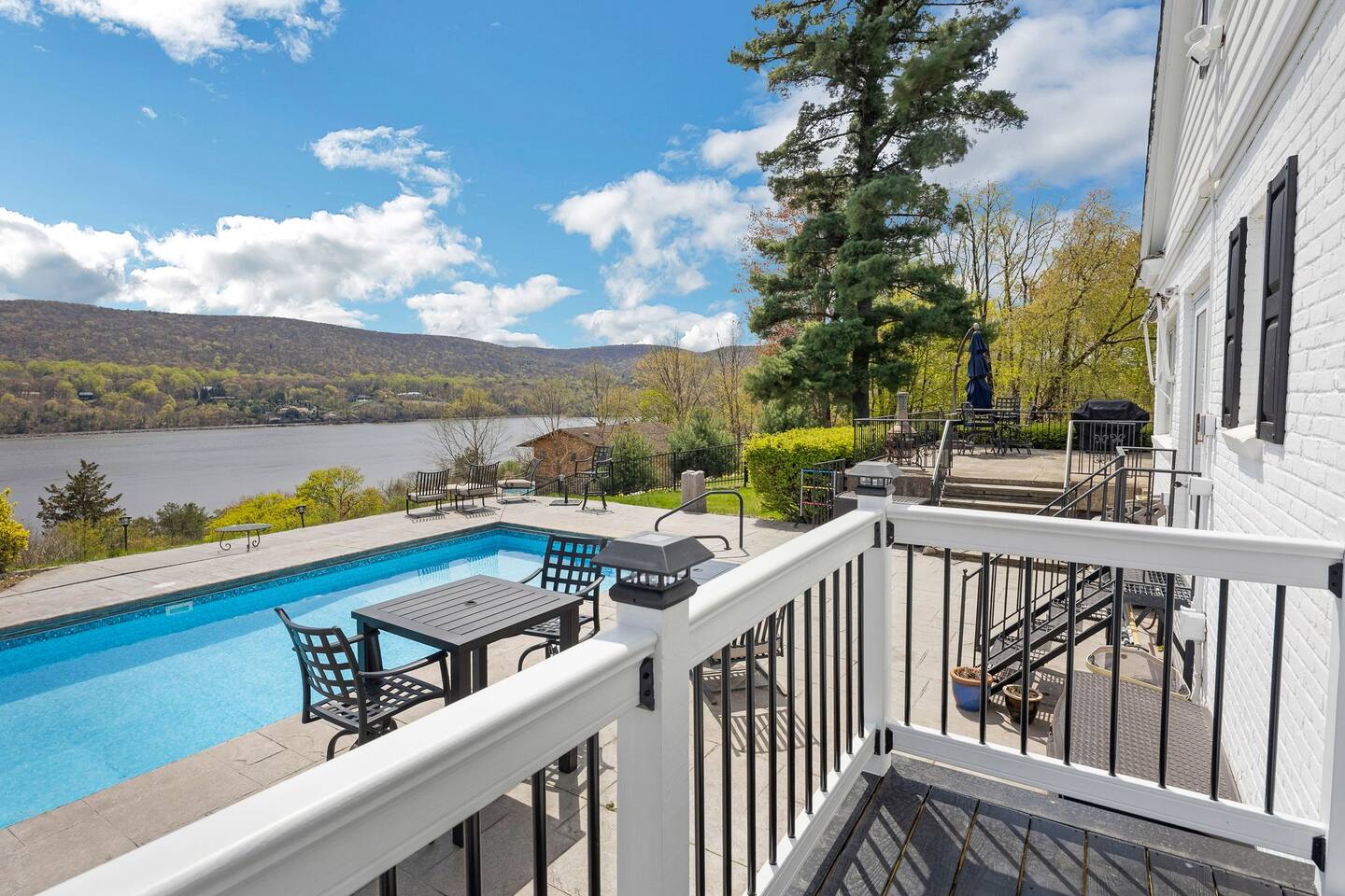 This is a beautifully renovated & famous home that has been completely upgraded with modern amenities. The home has a private saltwater pool overlooking the Hudson River, an indoor sauna, 7 bedrooms, 5 full baths, dining areas, and ample views of the Hudson River. It also has an instant fireplace (just press a button to light a cozy fire in the original fireplace) and ample TVs in many of the rooms (including a 100-inch television perfect for game day or family gatherings). The pool house provides a private second kitchen, 7th bedroom, 5th bathroom & additional sleeping space (Queen bed & a full-size pull-out couch) with more views of the Hudson River. J.P. Morgan named this property “Cragston” and he would relax here with his family and commute to NYC on his yacht just down the river. 4 of the trees on the property were actually planted by J.P. Morgan (likely his staff) and the massive exposed brick fireplace in the sunroom is original stone & brick where his staff would heat the home during winter months. Billy Joel famously also lived here in the 1970s. The primary bedroom upstairs overlooks the Hudson River and is where he wrote “New York State of Mind” and “Summer, Highland Falls” on his piano that was against the window at the time.