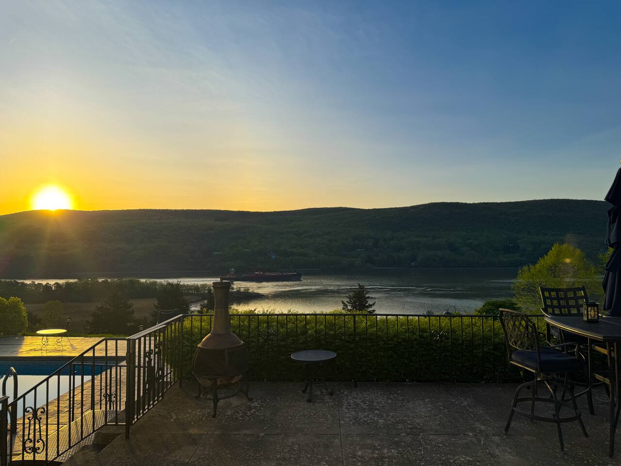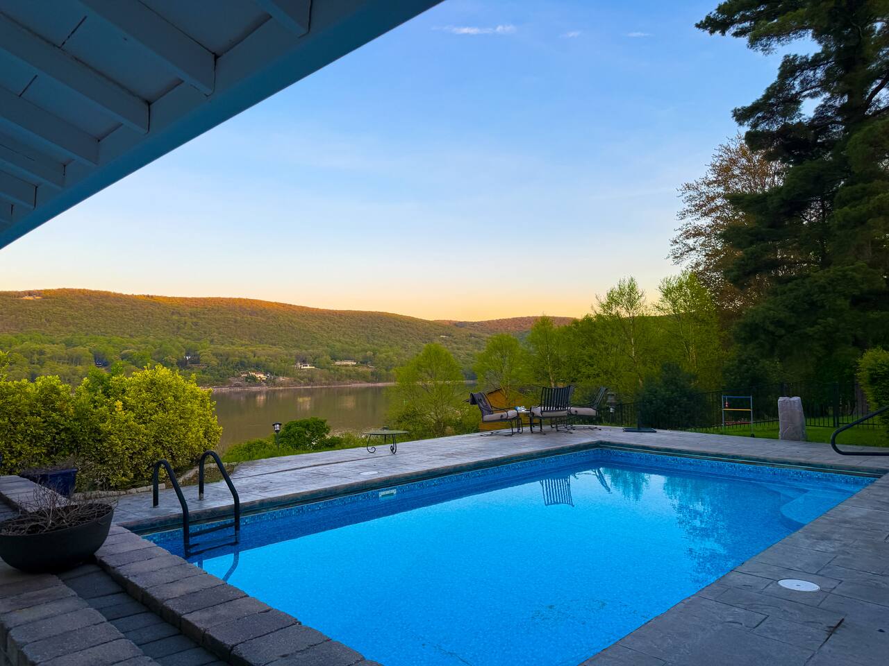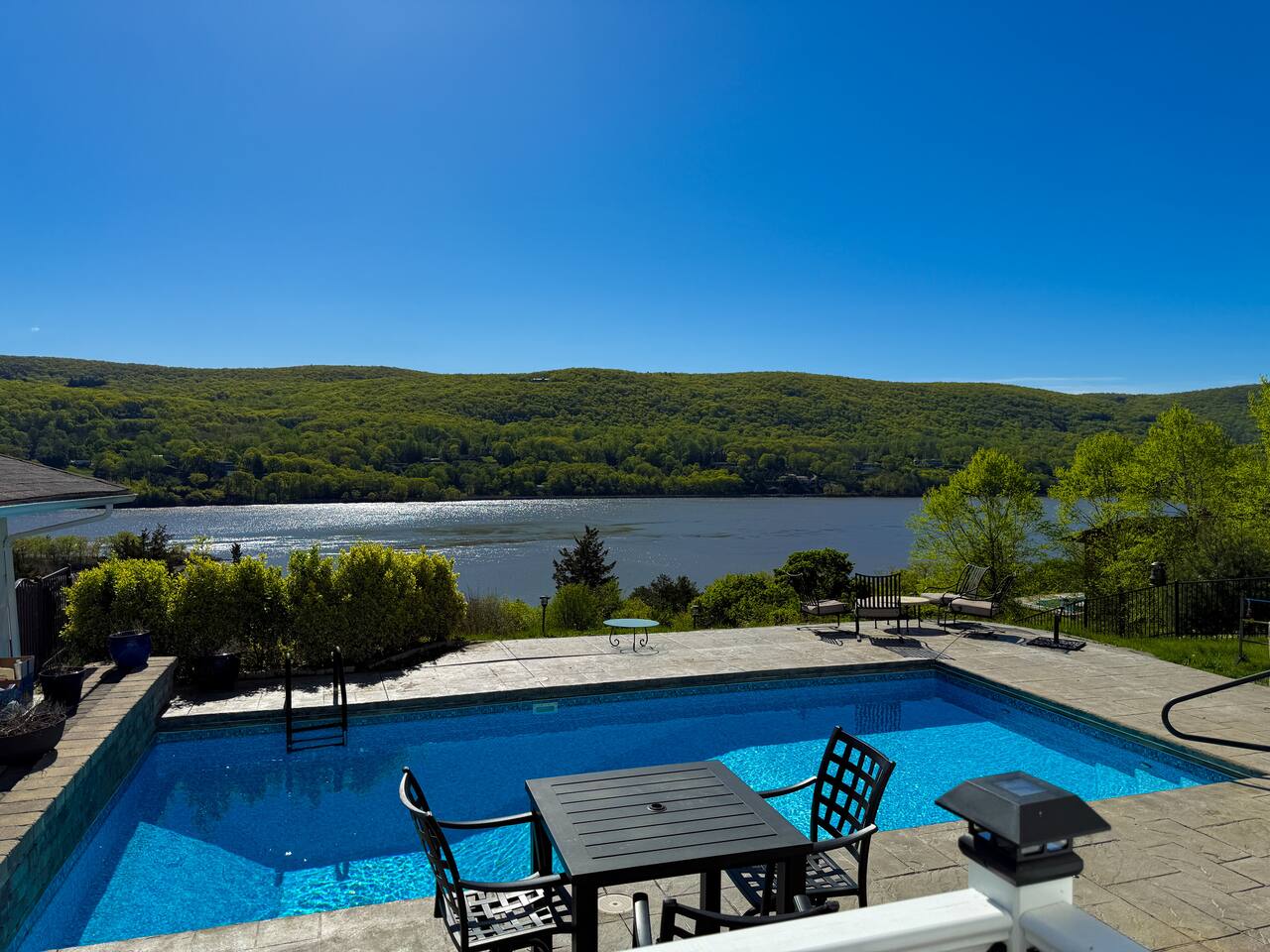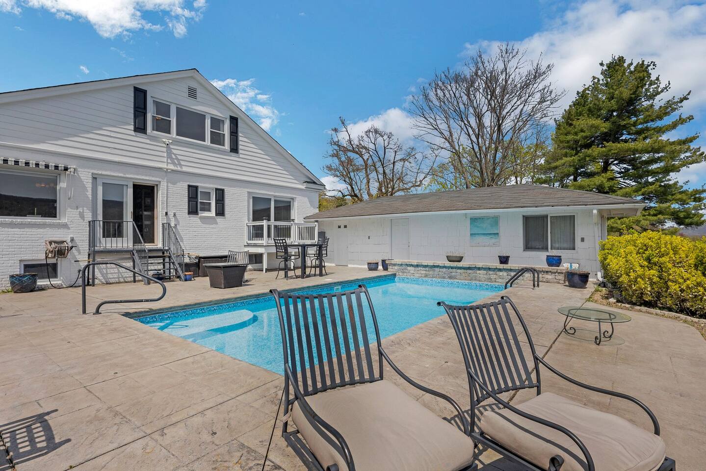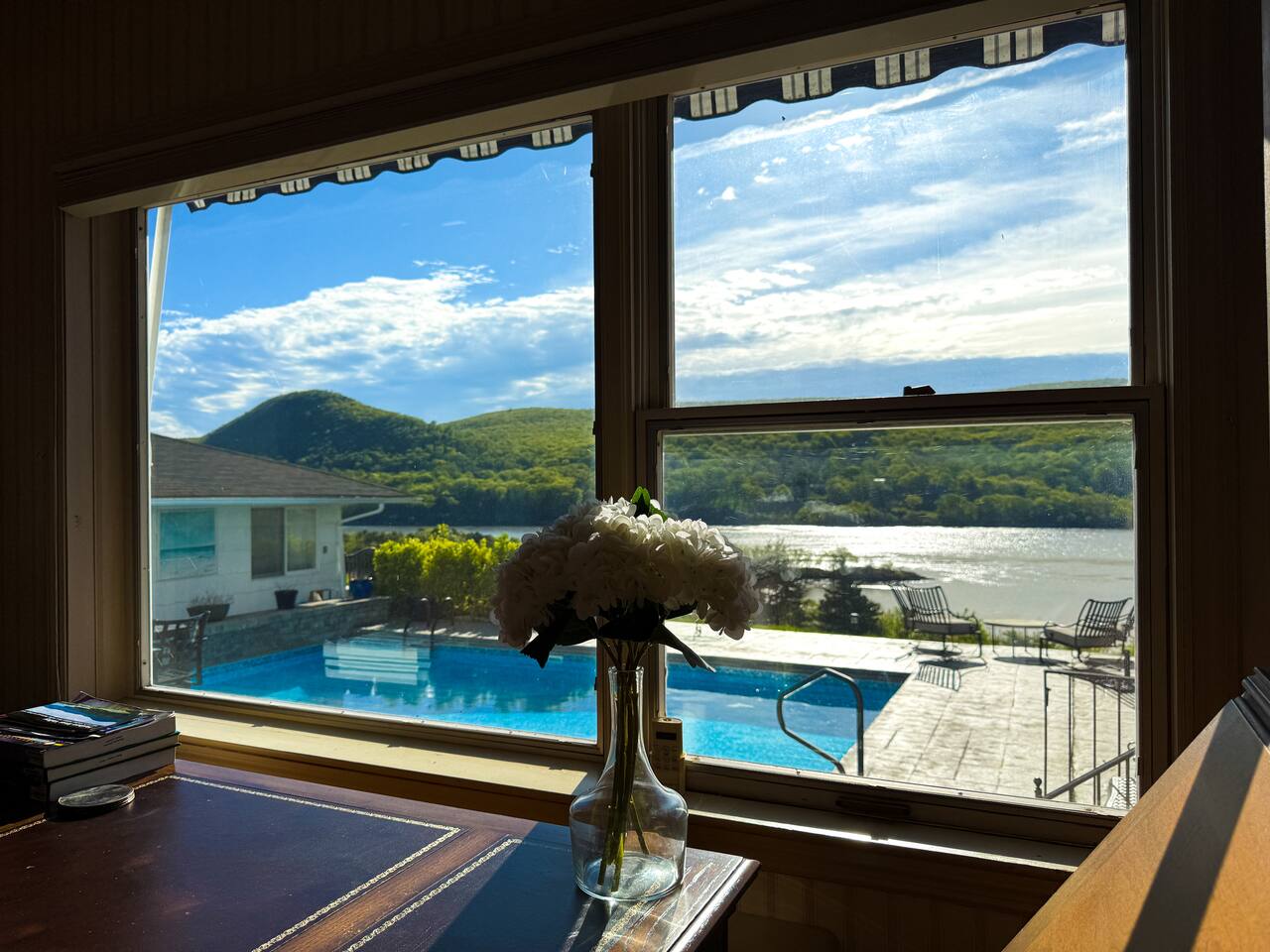 This is a beautifully renovated & famous home that has been completely upgraded with modern amenities. The home has a private saltwater pool overlooking the Hudson River, an indoor sauna, 7 bedrooms, 5 full baths, dining areas, and ample views of the Hudson River. It also has an instant fireplace (just press a button to light a cozy fire in the original fireplace) and ample TVs in many of the rooms (including a 100-inch television perfect for game day or family gatherings). The pool house provides a private second kitchen, 7th bedroom, 5th bathroom & additional sleeping space (Queen bed & a full-size pull-out couch) with more views of the Hudson River. J.P. Morgan named this property “Cragston” and he would relax here with his family and commute to NYC on his yacht just down the river. 4 of the trees on the property were actually planted by J.P. Morgan (likely his staff) and the massive exposed brick fireplace in the sunroom is original stone & brick where his staff would heat the home during winter months. Billy Joel famously also lived here in the 1970s. The primary bedroom upstairs overlooks the Hudson River and is where he wrote “New York State of Mind” and “Summer, Highland Falls” on his piano that was against the window at the time.