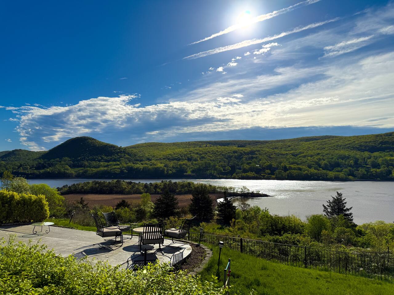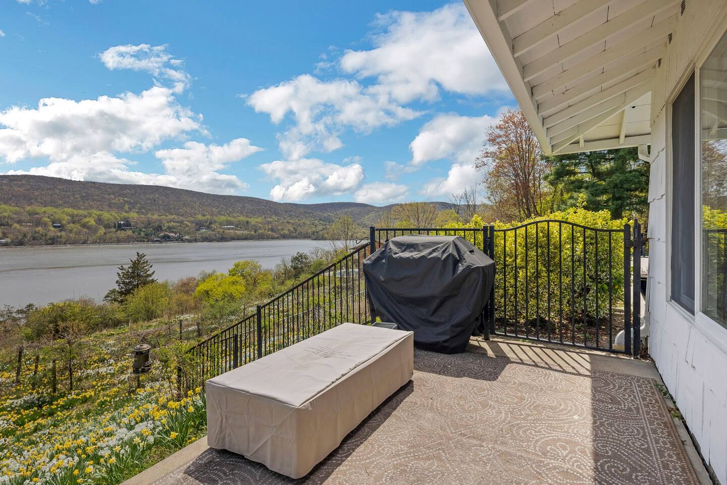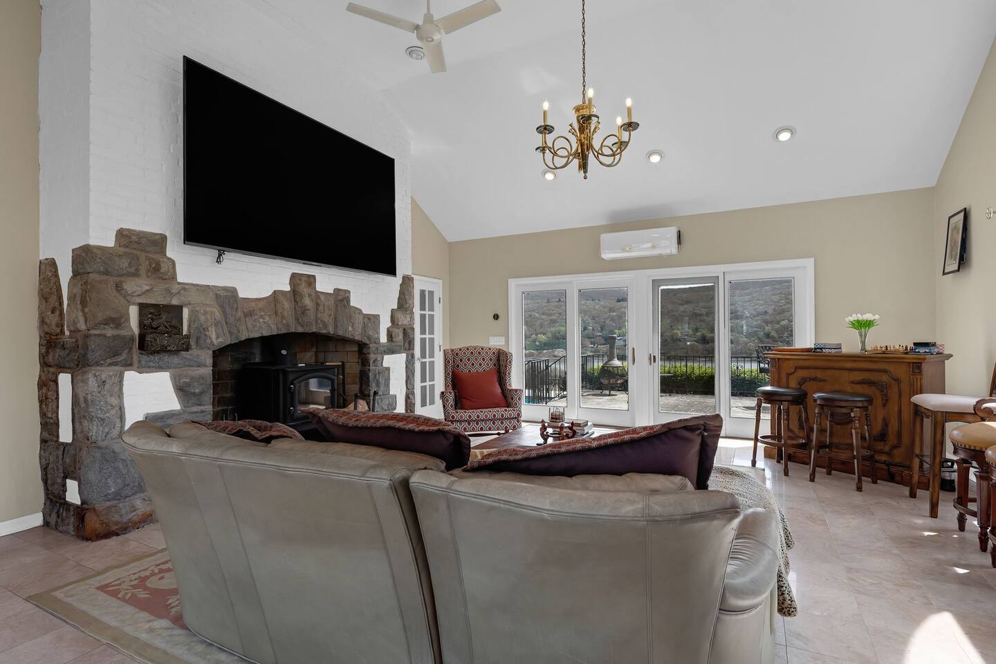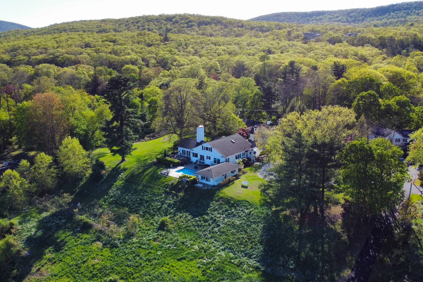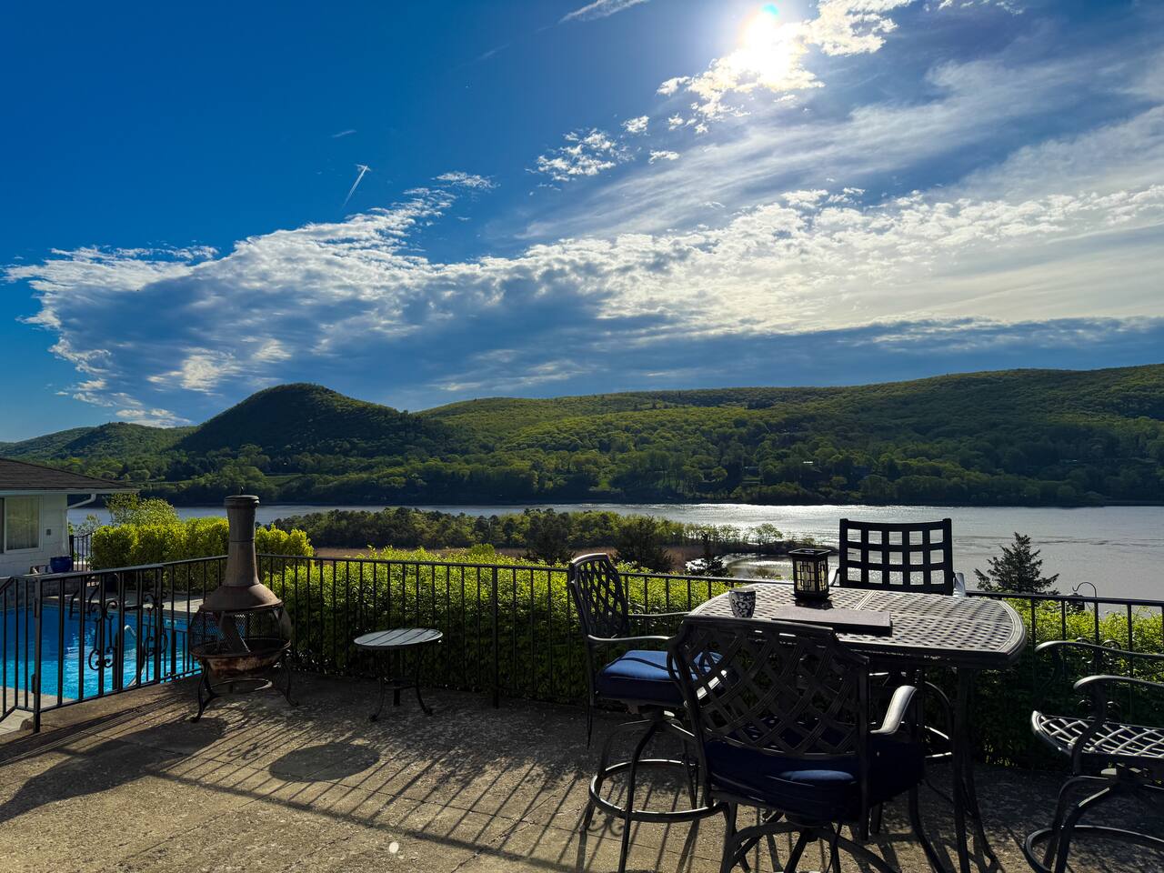 This is a beautifully renovated & famous home that has been completely upgraded with modern amenities. The home has a private saltwater pool overlooking the Hudson River, an indoor sauna, 7 bedrooms, 5 full baths, dining areas, and ample views of the Hudson River. It also has an instant fireplace (just press a button to light a cozy fire in the original fireplace) and ample TVs in many of the rooms (including a 100-inch television perfect for game day or family gatherings). The pool house provides a private second kitchen, 7th bedroom, 5th bathroom & additional sleeping space (Queen bed & a full-size pull-out couch) with more views of the Hudson River. J.P. Morgan named this property “Cragston” and he would relax here with his family and commute to NYC on his yacht just down the river. 4 of the trees on the property were actually planted by J.P. Morgan (likely his staff) and the massive exposed brick fireplace in the sunroom is original stone & brick where his staff would heat the home during winter months. Billy Joel famously also lived here in the 1970s. The primary bedroom upstairs overlooks the Hudson River and is where he wrote “New York State of Mind” and “Summer, Highland Falls” on his piano that was against the window at the time.