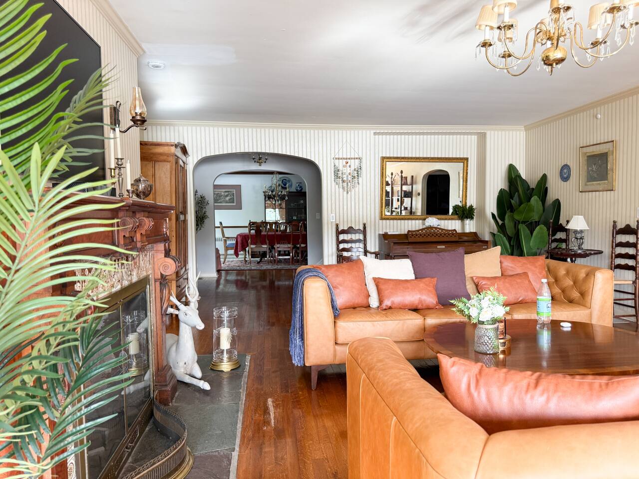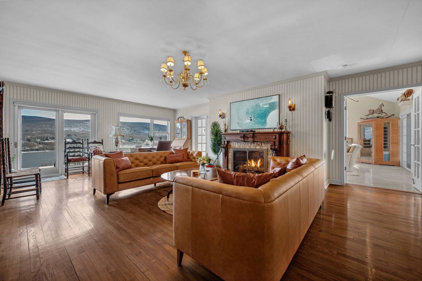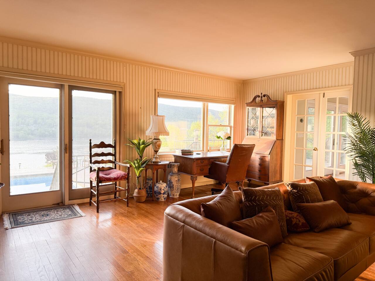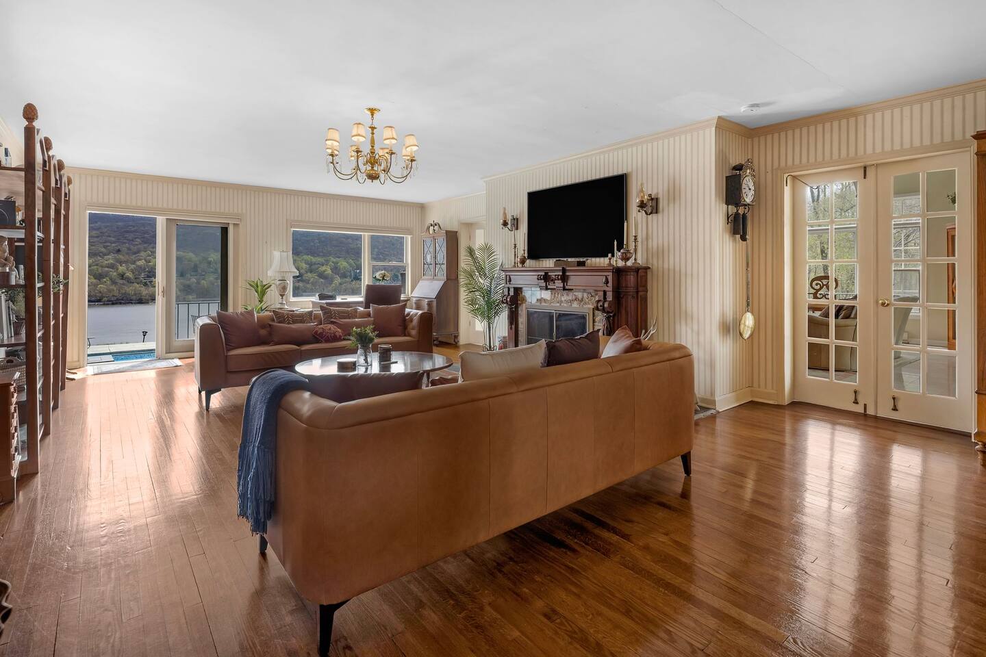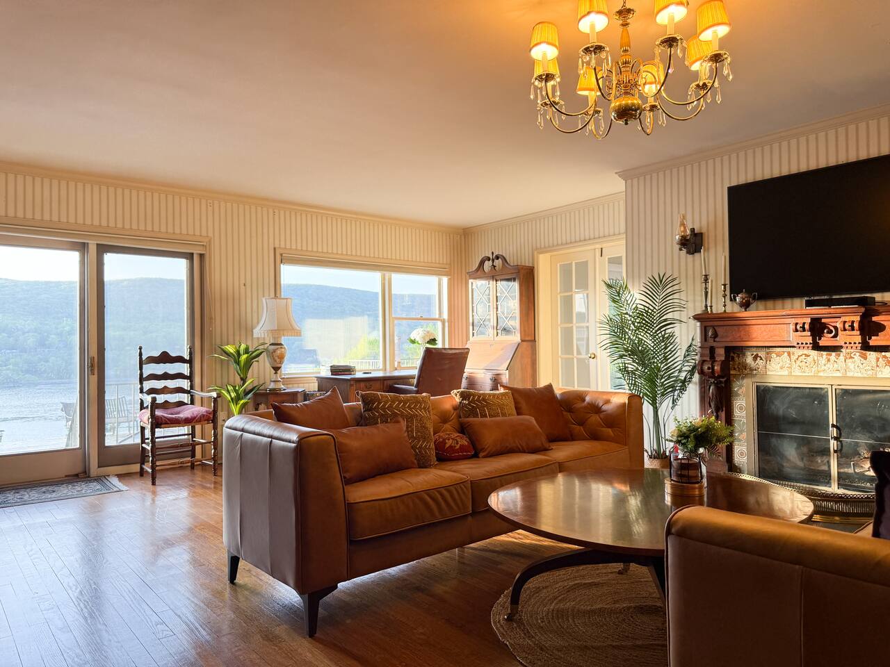 This is a beautifully renovated & famous home that has been completely upgraded with modern amenities. The home has a private saltwater pool overlooking the Hudson River, an indoor sauna, 7 bedrooms, 5 full baths, dining areas, and ample views of the Hudson River. It also has an instant fireplace (just press a button to light a cozy fire in the original fireplace) and ample TVs in many of the rooms (including a 100-inch television perfect for game day or family gatherings). The pool house provides a private second kitchen, 7th bedroom, 5th bathroom & additional sleeping space (Queen bed & a full-size pull-out couch) with more views of the Hudson River. J.P. Morgan named this property “Cragston” and he would relax here with his family and commute to NYC on his yacht just down the river. 4 of the trees on the property were actually planted by J.P. Morgan (likely his staff) and the massive exposed brick fireplace in the sunroom is original stone & brick where his staff would heat the home during winter months. Billy Joel famously also lived here in the 1970s. The primary bedroom upstairs overlooks the Hudson River and is where he wrote “New York State of Mind” and “Summer, Highland Falls” on his piano that was against the window at the time.