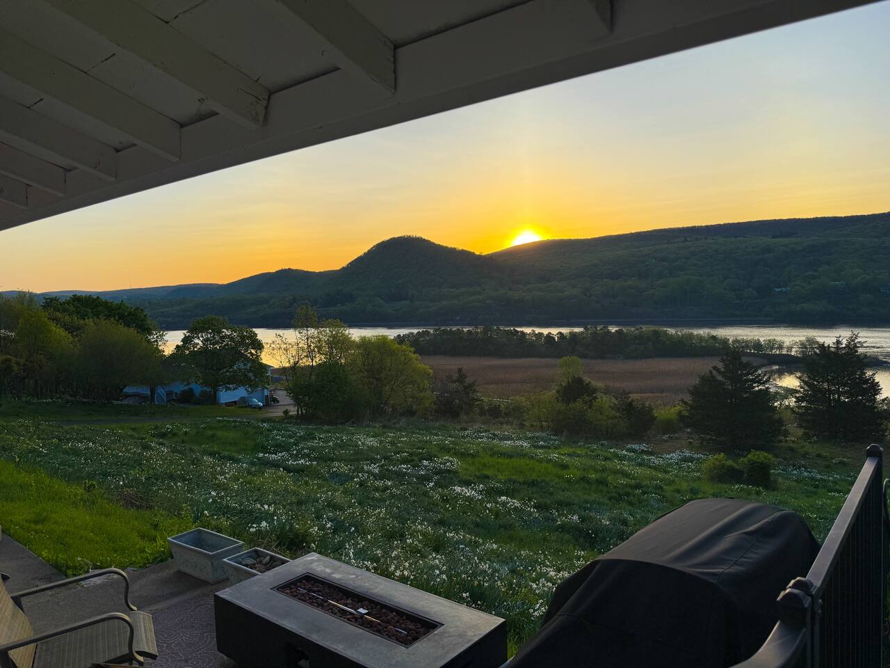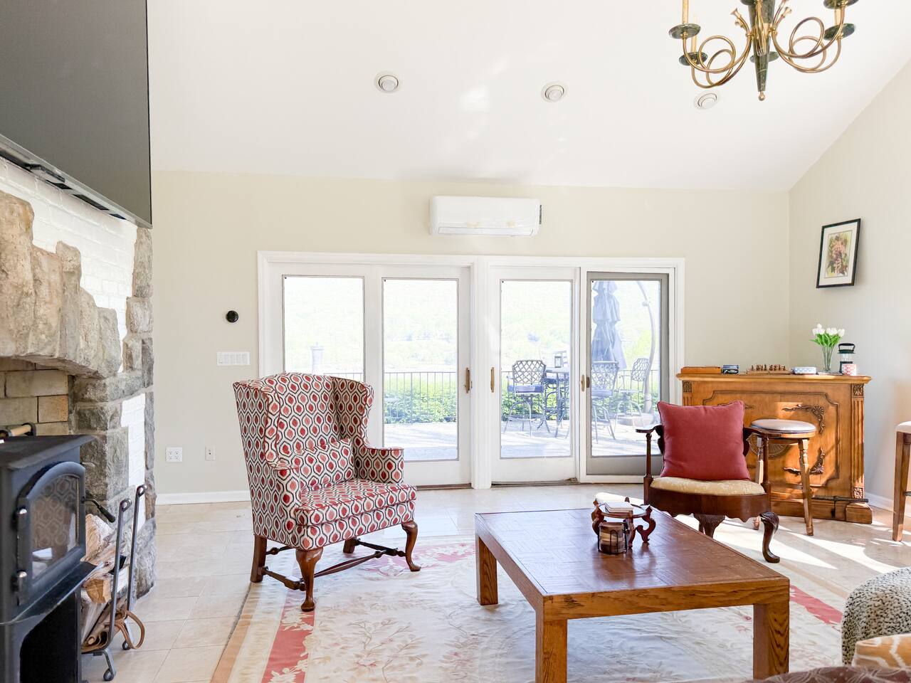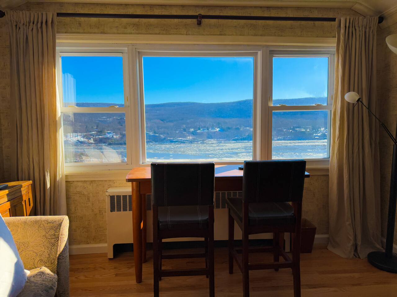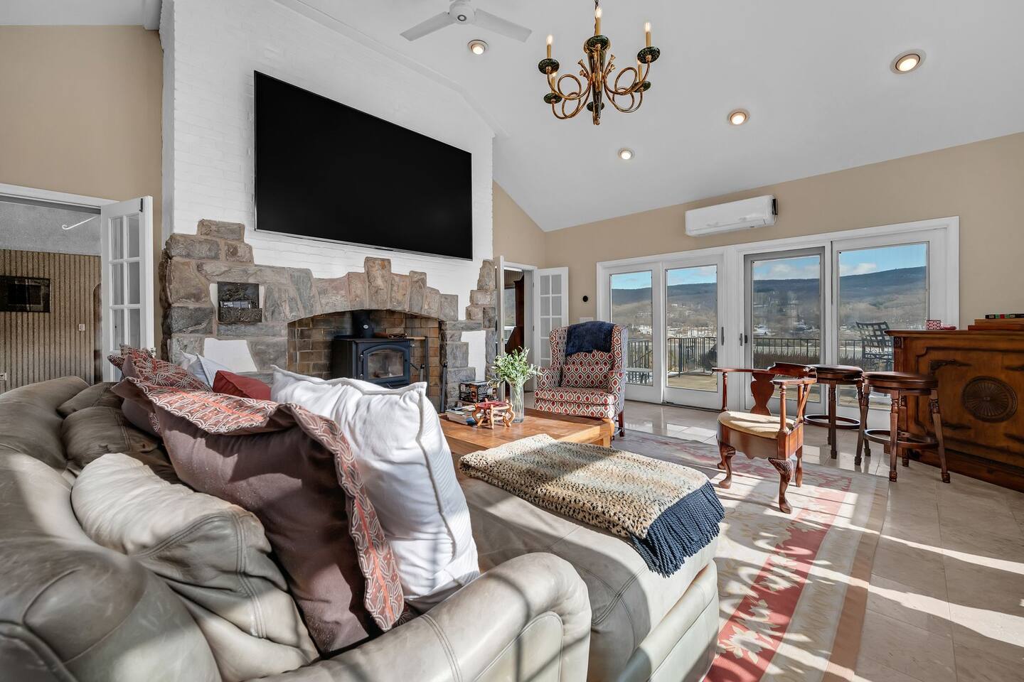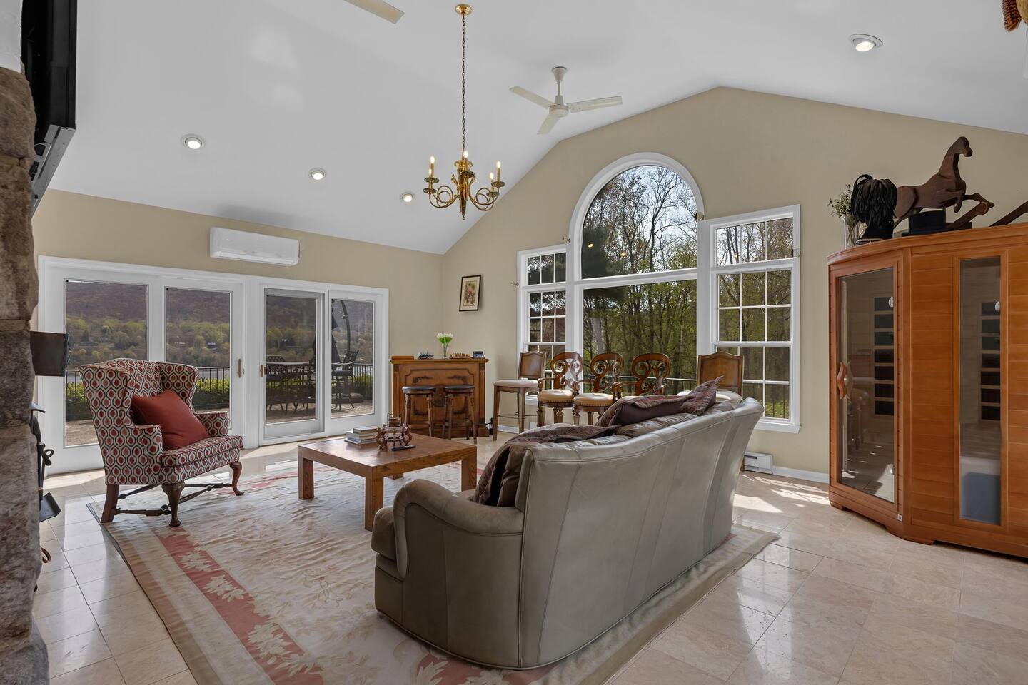 This is a beautifully renovated & famous home that has been completely upgraded with modern amenities. The home has a private saltwater pool overlooking the Hudson River, an indoor sauna, 7 bedrooms, 5 full baths, dining areas, and ample views of the Hudson River. It also has an instant fireplace (just press a button to light a cozy fire in the original fireplace) and ample TVs in many of the rooms (including a 100-inch television perfect for game day or family gatherings). The pool house provides a private second kitchen, 7th bedroom, 5th bathroom & additional sleeping space (Queen bed & a full-size pull-out couch) with more views of the Hudson River. J.P. Morgan named this property “Cragston” and he would relax here with his family and commute to NYC on his yacht just down the river. 4 of the trees on the property were actually planted by J.P. Morgan (likely his staff) and the massive exposed brick fireplace in the sunroom is original stone & brick where his staff would heat the home during winter months. Billy Joel famously also lived here in the 1970s. The primary bedroom upstairs overlooks the Hudson River and is where he wrote “New York State of Mind” and “Summer, Highland Falls” on his piano that was against the window at the time.