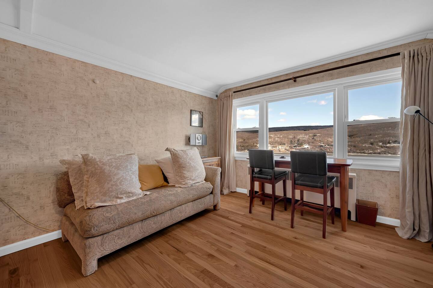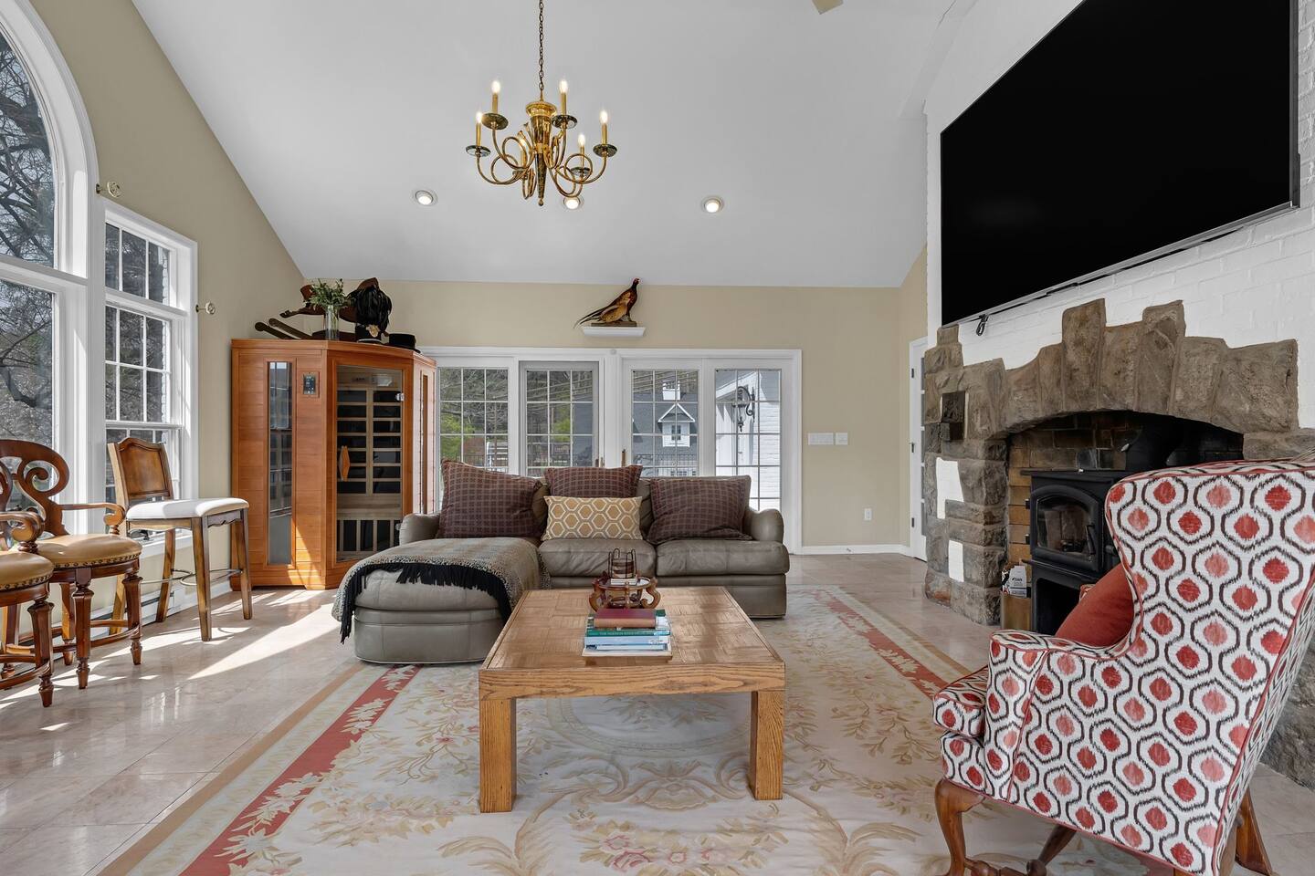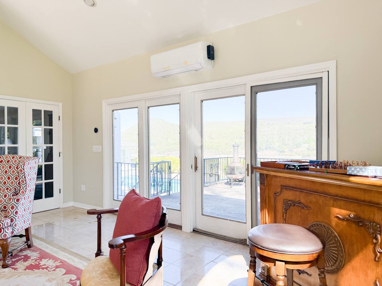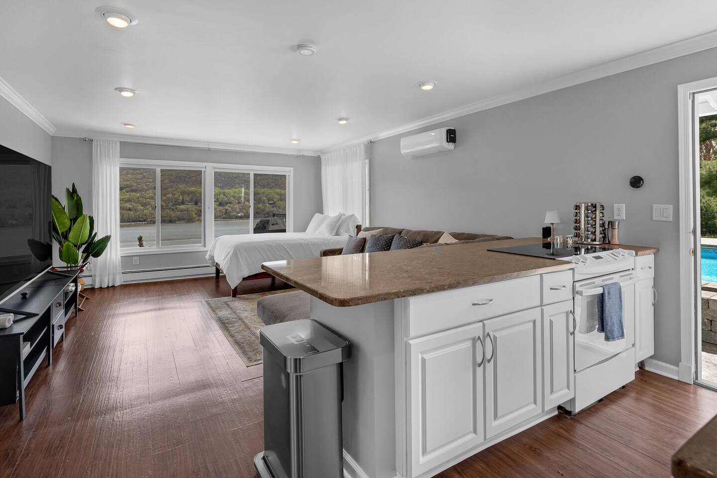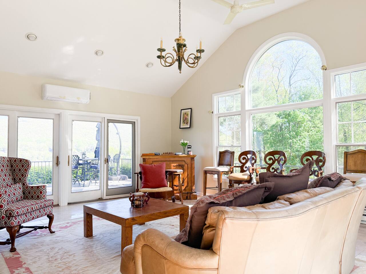This is a beautifully renovated & famous home that has been completely upgraded with modern amenities. The home has a private saltwater pool overlooking the Hudson River, an indoor sauna, 7 bedrooms, 5 full baths, dining areas, and ample views of the Hudson River. It also has an instant fireplace (just press a button to light a cozy fire in the original fireplace) and ample TVs in many of the rooms (including a 100-inch television perfect for game day or family gatherings). The pool house provides a private second kitchen, 7th bedroom, 5th bathroom & additional sleeping space (Queen bed & a full-size pull-out couch) with more views of the Hudson River. J.P. Morgan named this property “Cragston” and he would relax here with his family and commute to NYC on his yacht just down the river. 4 of the trees on the property were actually planted by J.P. Morgan (likely his staff) and the massive exposed brick fireplace in the sunroom is original stone & brick where his staff would heat the home during winter months. Billy Joel famously also lived here in the 1970s. The primary bedroom upstairs overlooks the Hudson River and is where he wrote “New York State of Mind” and “Summer, Highland Falls” on his piano that was against the window at the time.