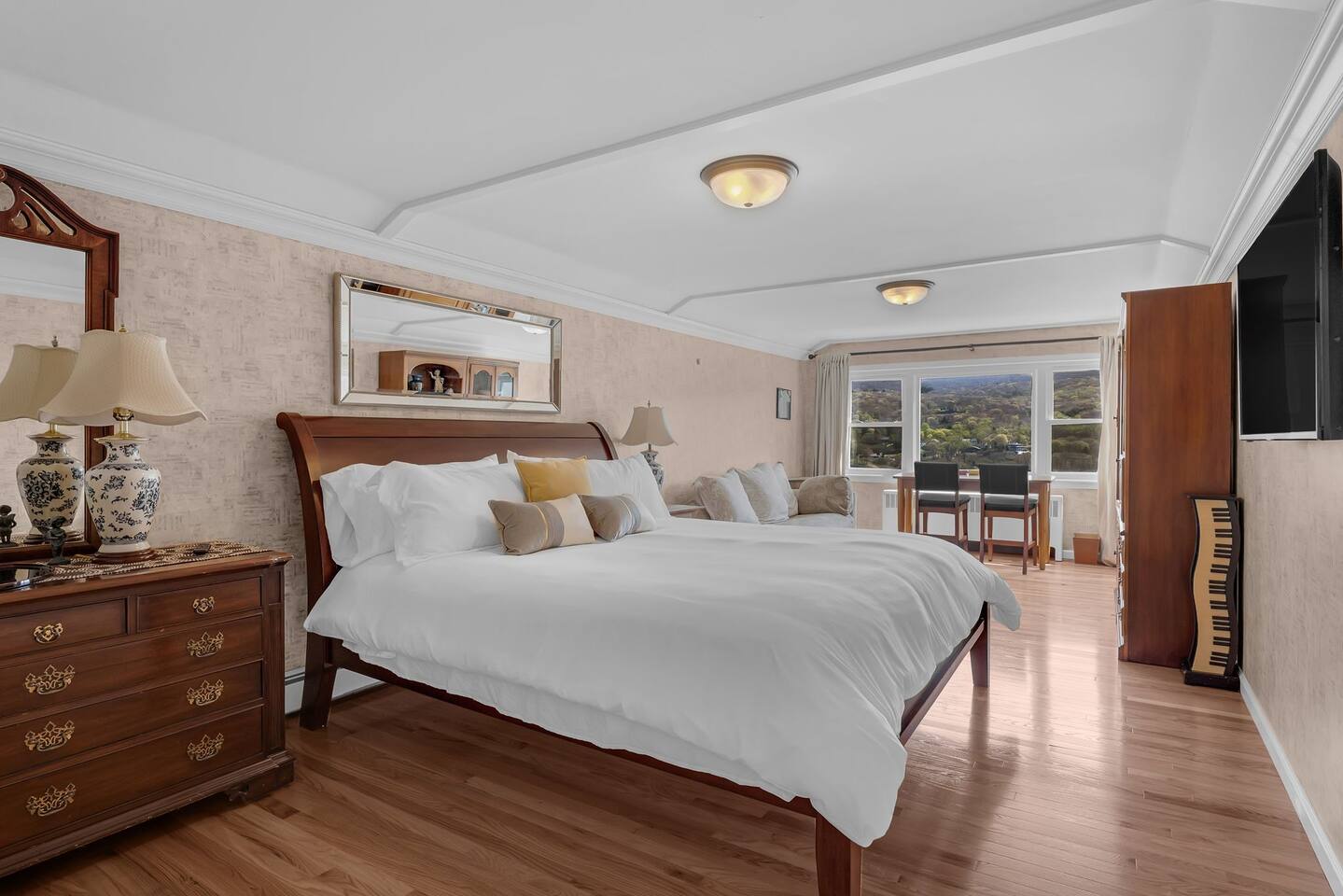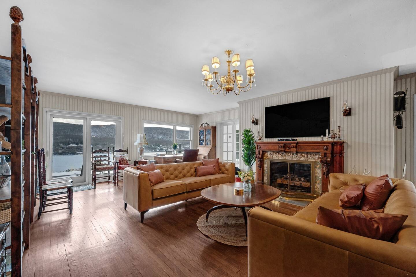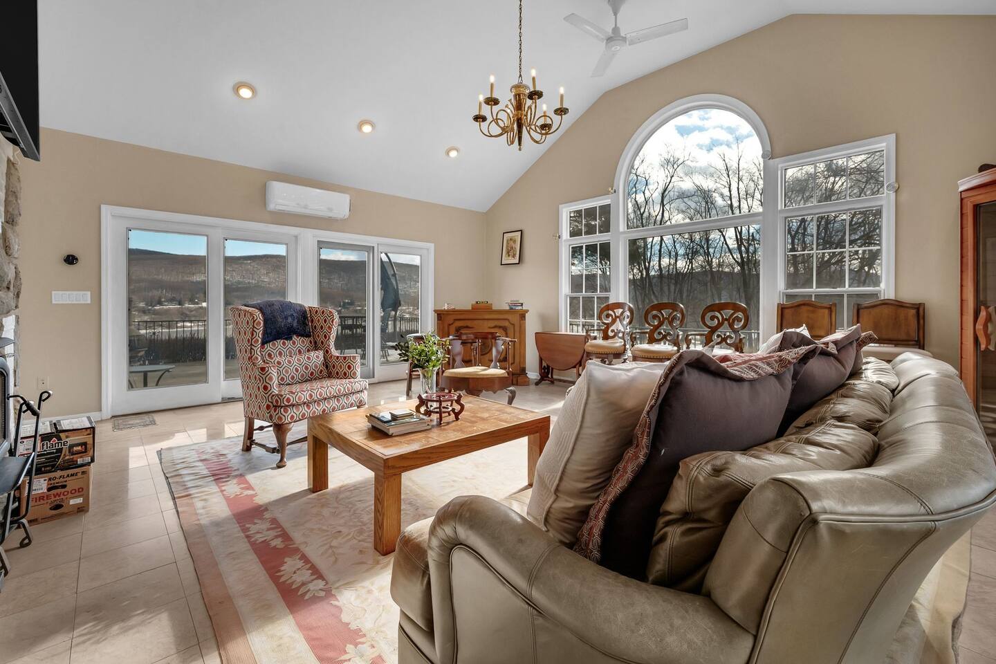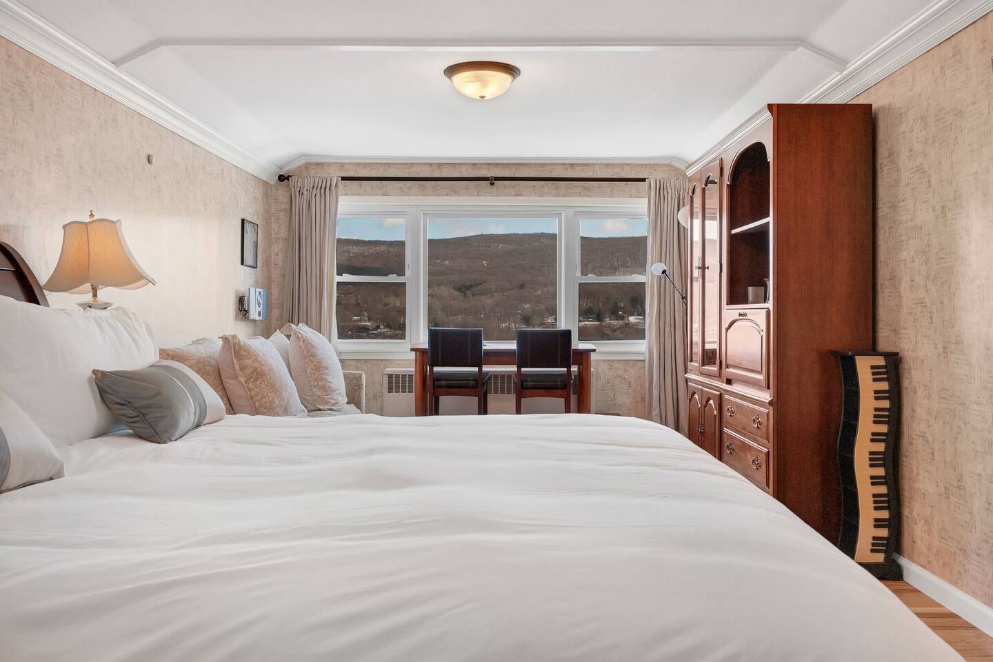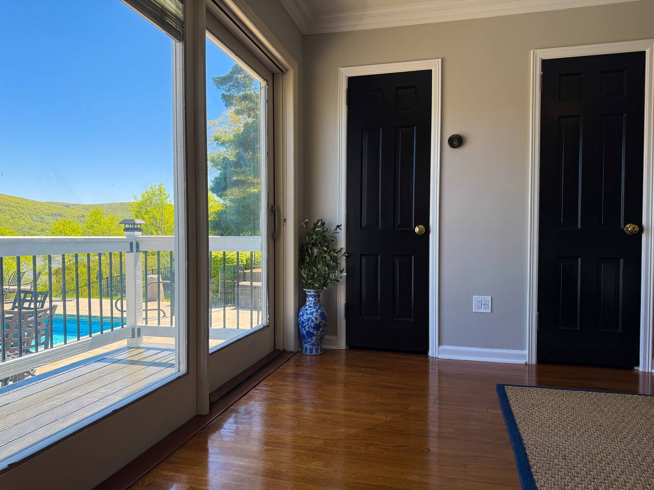 This is a beautifully renovated & famous home that has been completely upgraded with modern amenities. The home has a private saltwater pool overlooking the Hudson River, an indoor sauna, 7 bedrooms, 5 full baths, dining areas, and ample views of the Hudson River. It also has an instant fireplace (just press a button to light a cozy fire in the original fireplace) and ample TVs in many of the rooms (including a 100-inch television perfect for game day or family gatherings). The pool house provides a private second kitchen, 7th bedroom, 5th bathroom & additional sleeping space (Queen bed & a full-size pull-out couch) with more views of the Hudson River. J.P. Morgan named this property “Cragston” and he would relax here with his family and commute to NYC on his yacht just down the river. 4 of the trees on the property were actually planted by J.P. Morgan (likely his staff) and the massive exposed brick fireplace in the sunroom is original stone & brick where his staff would heat the home during winter months. Billy Joel famously also lived here in the 1970s. The primary bedroom upstairs overlooks the Hudson River and is where he wrote “New York State of Mind” and “Summer, Highland Falls” on his piano that was against the window at the time.