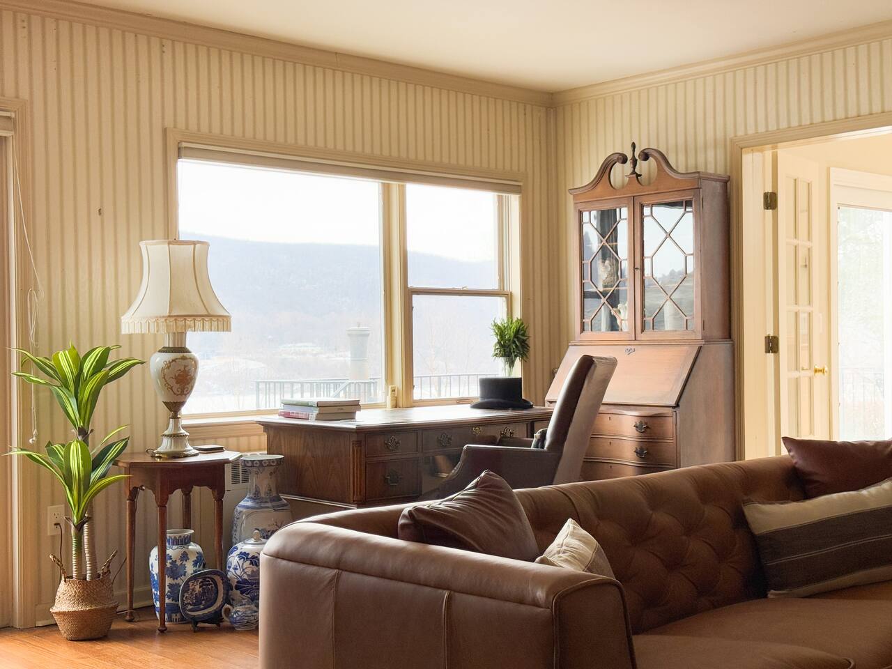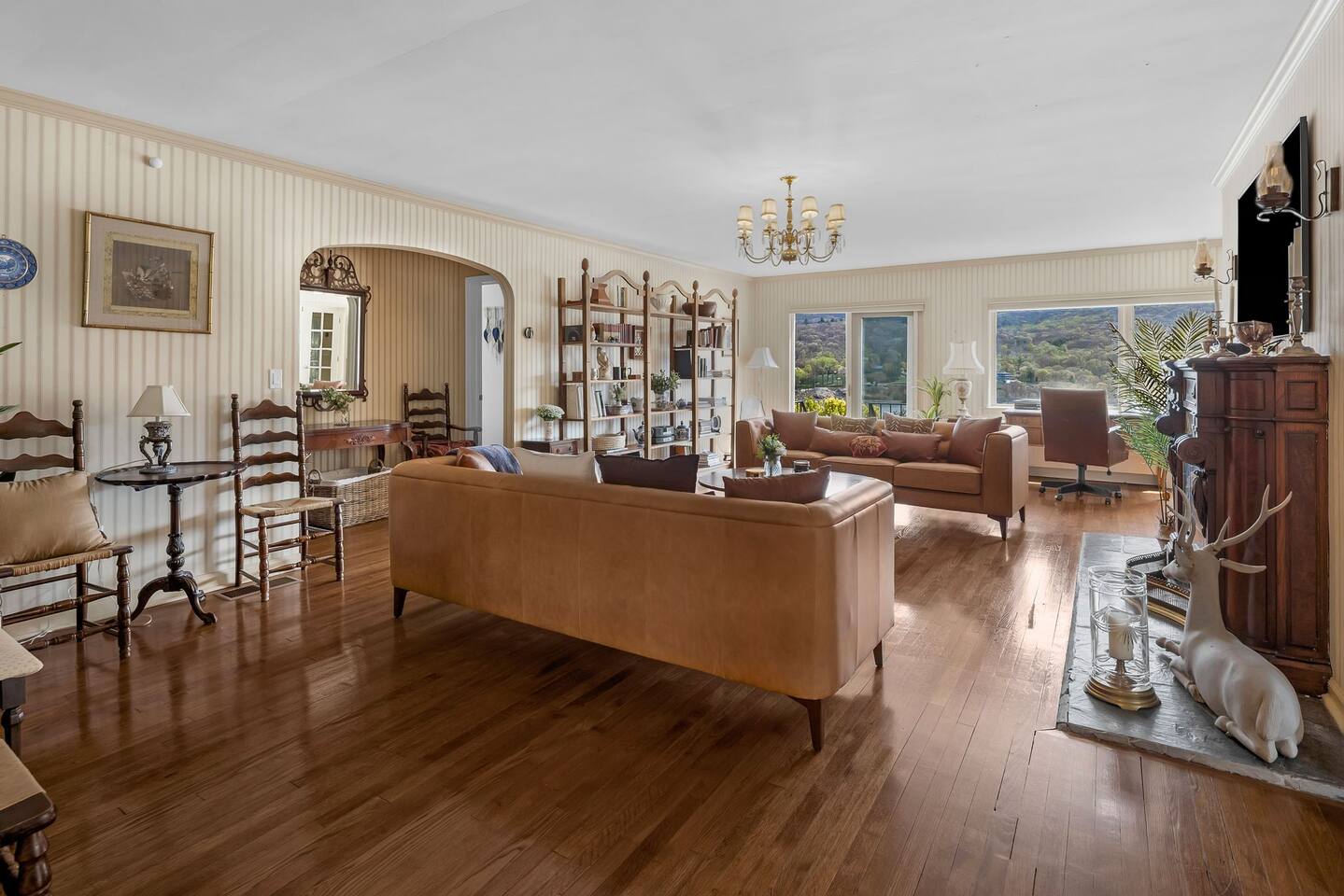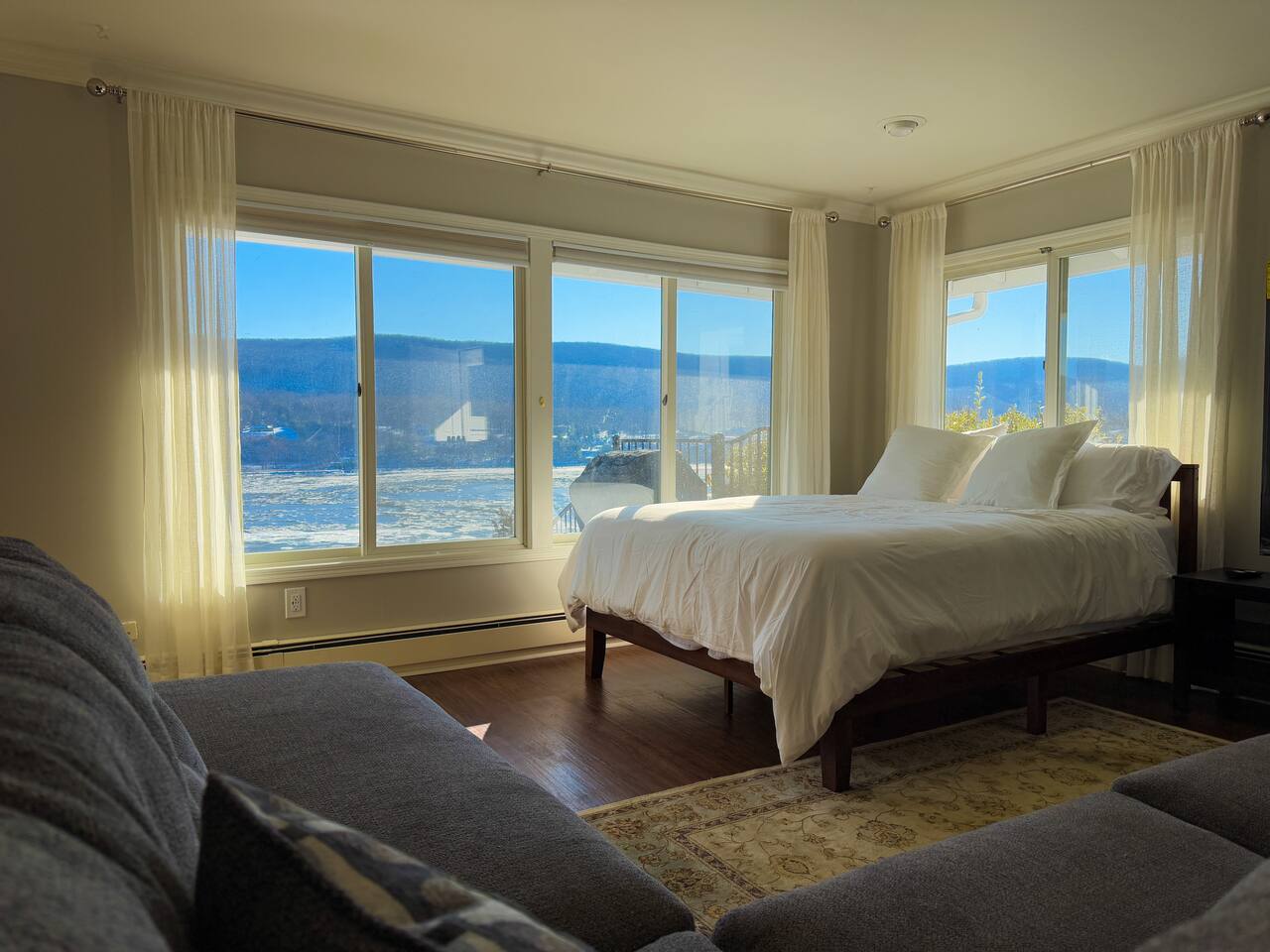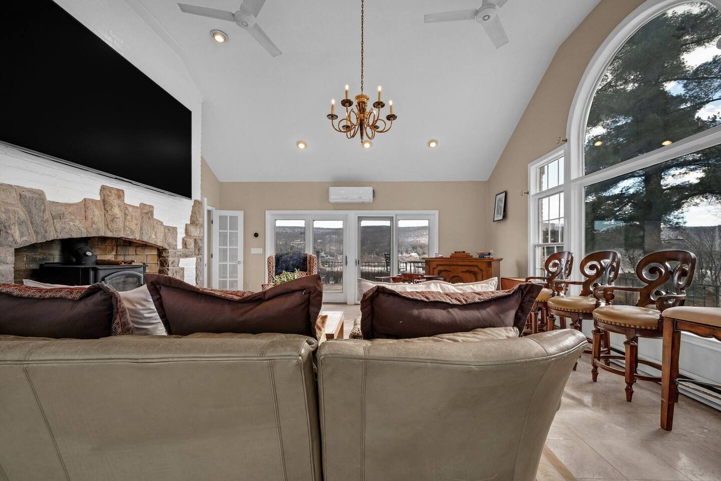 This is a beautifully renovated & famous home that has been completely upgraded with modern amenities. The home has a private saltwater pool overlooking the Hudson River, an indoor sauna, 7 bedrooms, 5 full baths, dining areas, and ample views of the Hudson River. It also has an instant fireplace (just press a button to light a cozy fire in the original fireplace) and ample TVs in many of the rooms (including a 100-inch television perfect for game day or family gatherings). The pool house provides a private second kitchen, 7th bedroom, 5th bathroom & additional sleeping space (Queen bed & a full-size pull-out couch) with more views of the Hudson River. J.P. Morgan named this property “Cragston” and he would relax here with his family and commute to NYC on his yacht just down the river. 4 of the trees on the property were actually planted by J.P. Morgan (likely his staff) and the massive exposed brick fireplace in the sunroom is original stone & brick where his staff would heat the home during winter months. Billy Joel famously also lived here in the 1970s. The primary bedroom upstairs overlooks the Hudson River and is where he wrote “New York State of Mind” and “Summer, Highland Falls” on his piano that was against the window at the time.