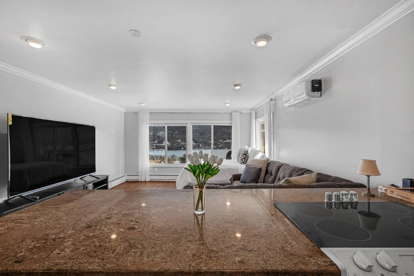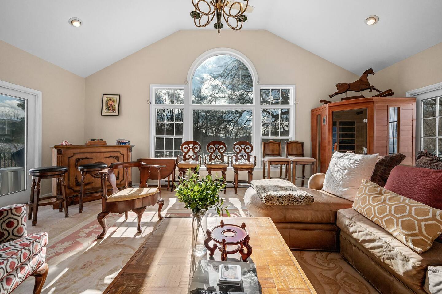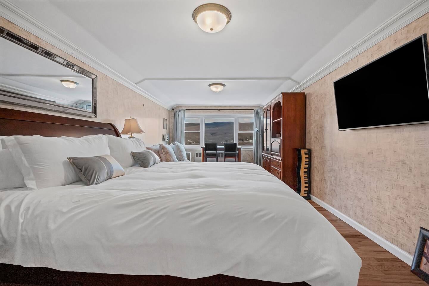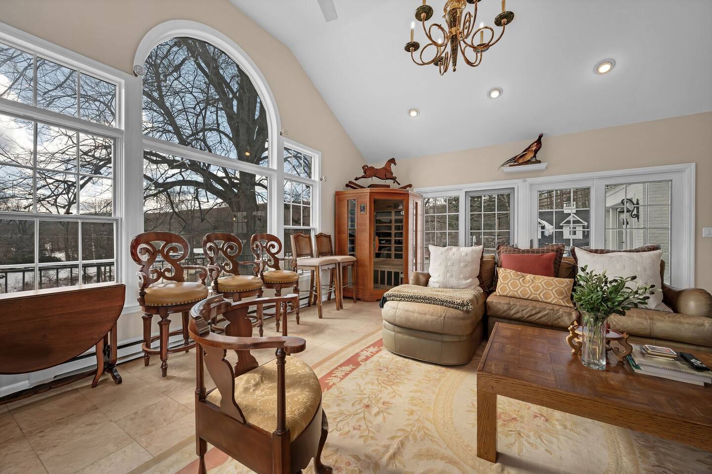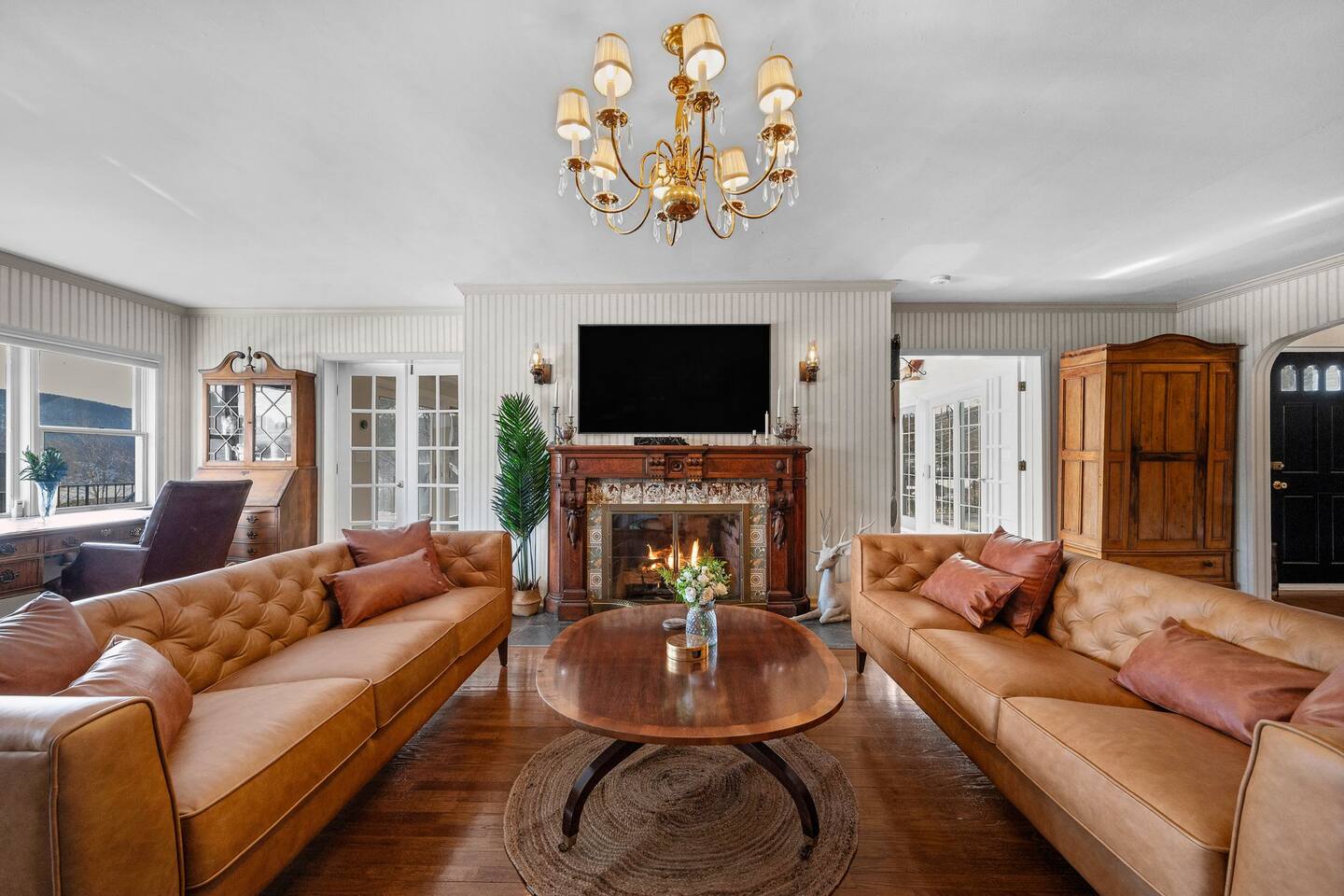 This is a beautifully renovated & famous home that has been completely upgraded with modern amenities. The home has a private saltwater pool overlooking the Hudson River, an indoor sauna, 7 bedrooms, 5 full baths, dining areas, and ample views of the Hudson River. It also has an instant fireplace (just press a button to light a cozy fire in the original fireplace) and ample TVs in many of the rooms (including a 100-inch television perfect for game day or family gatherings). The pool house provides a private second kitchen, 7th bedroom, 5th bathroom & additional sleeping space (Queen bed & a full-size pull-out couch) with more views of the Hudson River. J.P. Morgan named this property “Cragston” and he would relax here with his family and commute to NYC on his yacht just down the river. 4 of the trees on the property were actually planted by J.P. Morgan (likely his staff) and the massive exposed brick fireplace in the sunroom is original stone & brick where his staff would heat the home during winter months. Billy Joel famously also lived here in the 1970s. The primary bedroom upstairs overlooks the Hudson River and is where he wrote “New York State of Mind” and “Summer, Highland Falls” on his piano that was against the window at the time.